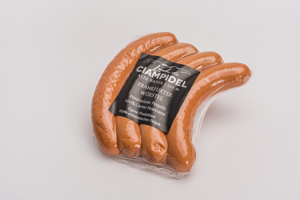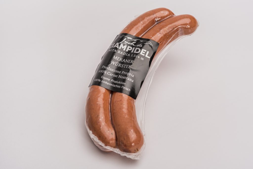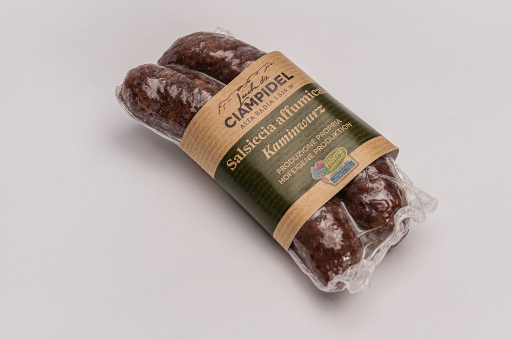 Sapore mite, non affumicata, budello naturale, carne bovina- e suina ca. 0,35 kg. Ingredienti: Carne di bovino 45%, carne di suino 40%, acqua, lardo, sale, spezie. Addensanti: polifosfato; antiossidandi: ascorbato di sodio; conservanti: nitrito di sodio;