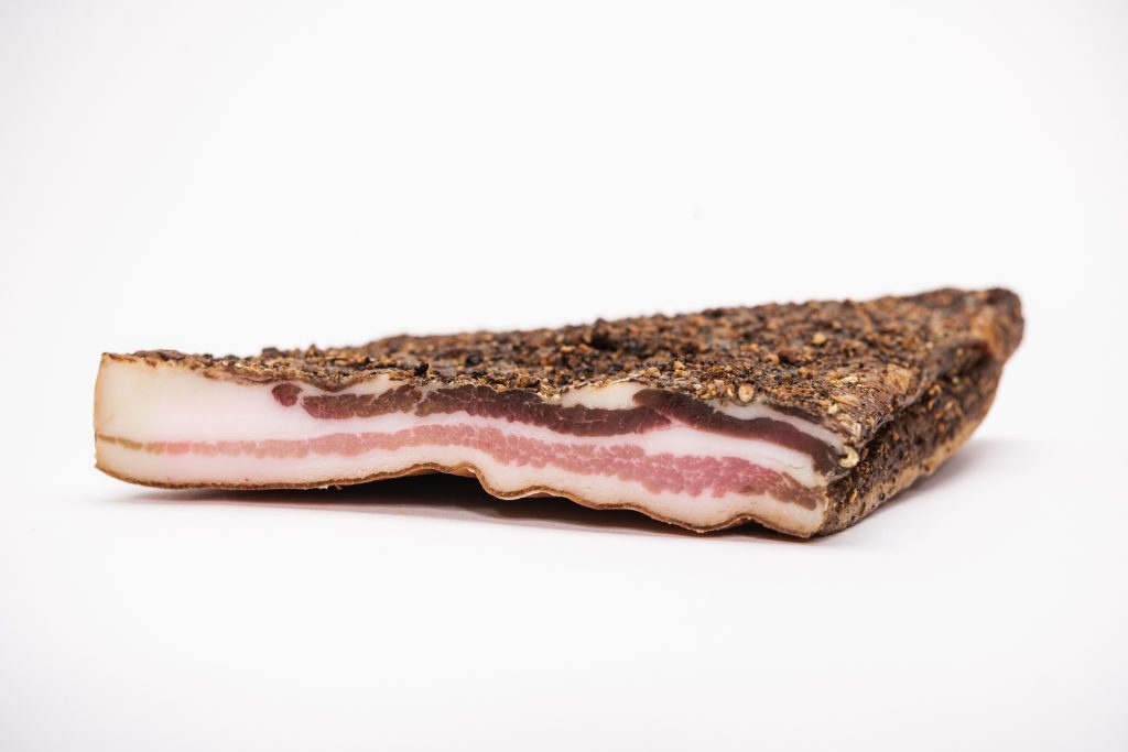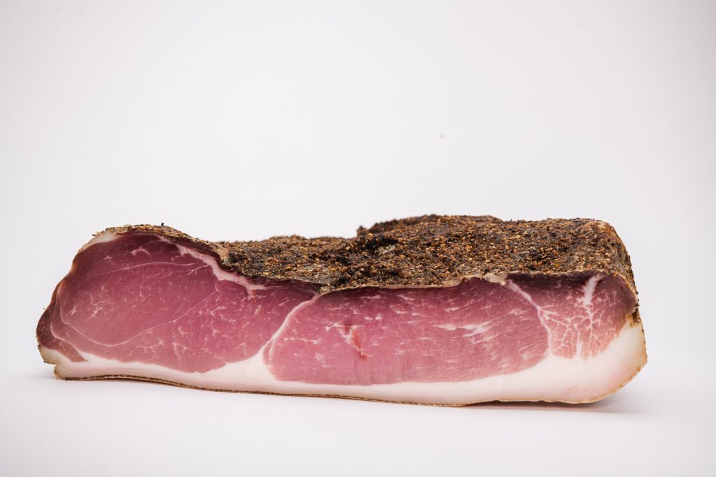 100 % pancia di maiale, leggermente saporito, affumicatura con ginepro e faggio, stagionatura dai 6-7.